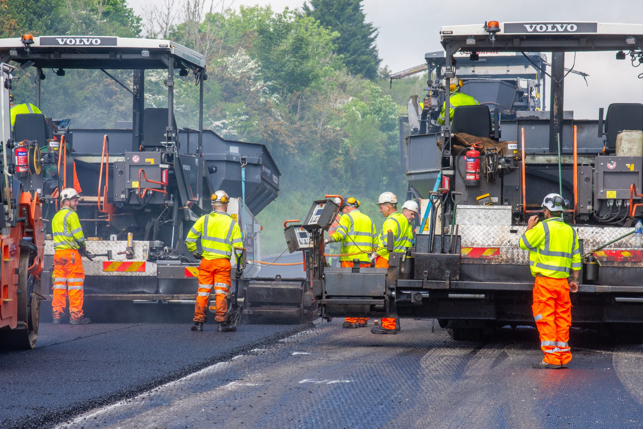 To minimise disruption on this busy route, the project employed Echelon paving with a power feeder, operating two pavers in tandem. This approach allowed surfacing gangs to work simultaneously, ensuring timely delivery while maintaining high-quality standards, maximising operational efficiency and crucially achieving a seamless finish across all 3 lanes of the carriageway.